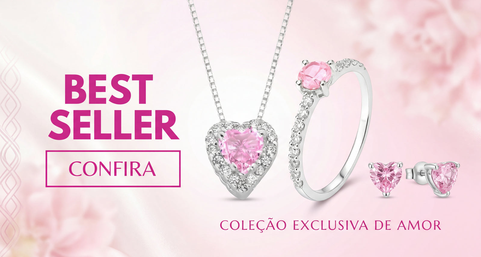 Kit anel Aurora rosa+V cravejado, Colar coração rosa e Brincos coração rosa